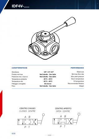 Когда рукоятка находится в положении 1 поток идет в порт В, одновременно с этим поток из порта А поступает в порт Т, когда в положении 2 –поток из порта Р поступает в порт А, а из порта В идет в порт Т. Дивертор типа С (с закрытым центром): в нейтральном положении все порты закрыты (возможны незначительные утечки), дивертор типа А (с открытым центром): в нейтральном положении соединены порты P c Т, А и В закрыты.