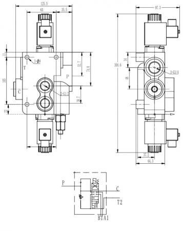 Моноблочный гидрораспределитель серии Z80 с электромагнитным управлением предназначен для изменения направления потока, ограничения давления рабочей жидкости в гидролиниях, разгрузки насоса в нейтральной позиции золотников. Конструктивно данный тип распределителей выполнен в литом монолитном корпусе, с предохранительным клапаном, от 1 до 6 рабочих секций, с возможным применением золотников типа A или D. Номинальный расход данного типа гидравлического распределителя - 80 л/мин.