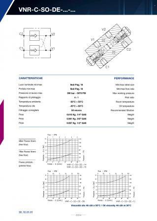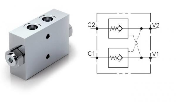 Гидрозамок двухстороннего действия VNR-C-SO-DE-12 003.050 предназначен для удержания гидравлических двигателей в статическом положении под нагрузкой. Гидравлическая жидкость блокируется в полостях гидродвигателя C1 и C2 при отсутствии давления в линиях V1 и V2.