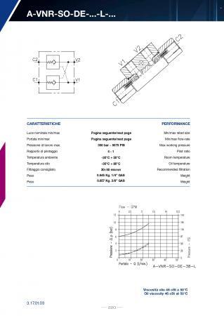 Гидрозамок двухстороннего действия A-VNR-SO-DE-38-L 003.360 предназначен для удержания гидравлических двигателей в статическом положении под нагрузкой. Гидравлическая жидкость блокируется в полости гидродвигателя C1 и C2 при отсутствии давления в линии V1 и V2.