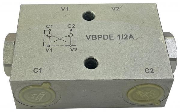 Гидрозамок двухстороннего действия VRDL/L-G1/2 предназначен для удержания гидравлических двигателей в статическом положении под нагрузкой. Гидравлическая жидкость блокируется в полости гидродвигателя C1 и C2 при отсутствии давления в линии V1 и V2.