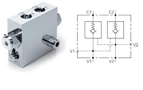 VNR-C-SO-DE-50-SP-FCB — Гидрозамок двухстороннего действия, позволяет двухстороннему гидроцилиндру оставаться в неподвижном состоянии с одной из сторон управления при внешних воздействиях. Клапан имеет устройство, которое позволяет запирать поток в одном из каналов, и откроется если подать давление в другую линию для открытия. Такие устройства часто используются в прессовом оборудовании, а также в подъемных устройствах с гидроприводом. Присоединение к линии C1 трубная цилиндрическая резьба и C2 через banjo к цилиндру.