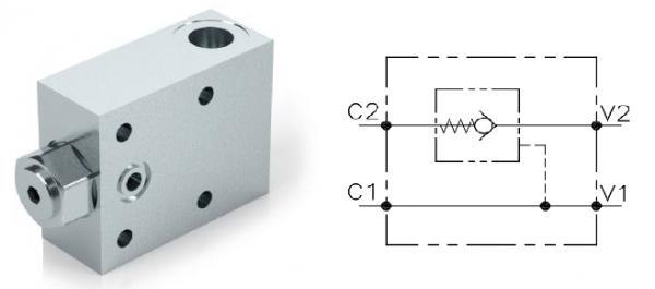 Гидрозамок одностороннего действия VNR-C-SO-SE-12-FC1 003.043 предназначен для удержания гидравлических двигателей в статическом положении под нагрузкой. Гидравлическая жидкость блокируется в полости гидродвигателя C2 при отсутствии давления в линии V1. Эти гидрозамки могут устанавливаться непосредственно на гидроцилиндр.