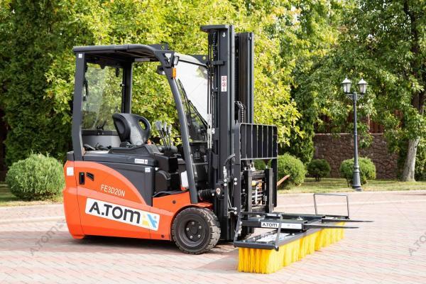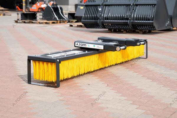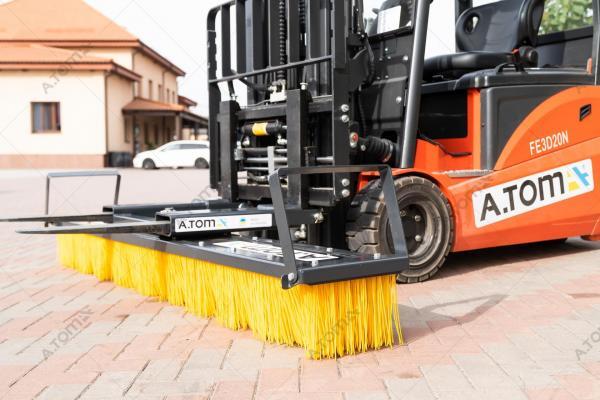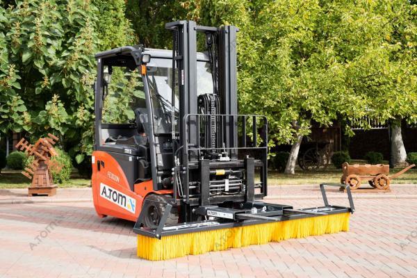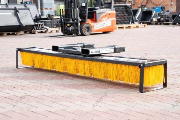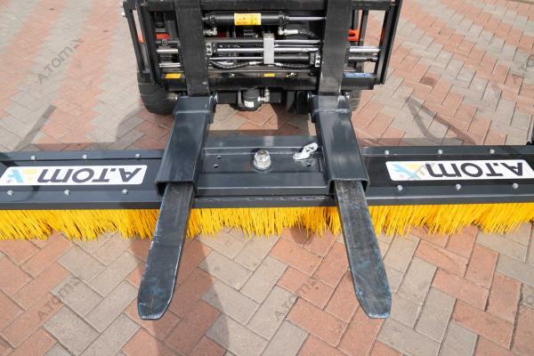 Щетка дорожная на вилочный погрузчик - AТOM 2500 предназначена для механизированной очистки дорог, тротуаров, парковок, площадей, скверов, производственных территорий от листьев, снега, песка, мусора и других отходов. Щетка дорожная на вилочный погрузчик оснащена специальными щетинами, расположенными на передней части оборудования. Эти щетины эффективно очищают мусор и другие загрязнения на дорожной поверхности. Благодаря своей настраиваемой гибкости и высоте щетка обеспечивает оптимальное прилегание к поверхности дороги, позволяя эффективно собирать грязь даже с неровных или текстурированных поверхностей. Такое оборудование простое в использовании. Устройство легко устанавливается на вилочный погрузчик и обеспечивает быструю и эффективную очистку дорог. Управление щеткой осуществляется из кабины водителя. Щетка дорожная является незаменимым инструментом для работы коммунальных служб, дорожных предприятий и строительных компаний.
