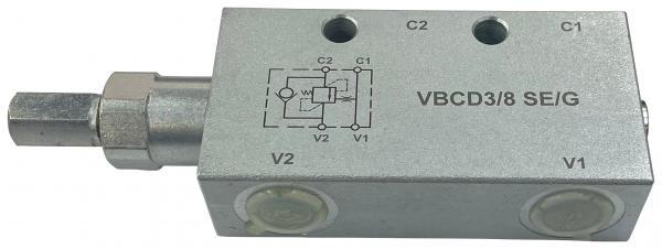 Односторонние тормозные клапаны VBCD-G3/8 SE/G предназначены для обеспечения плавного опускания нагруженных попутной нагрузкой гидродвигателей. Кроме того, клапаны обеспечивают функцию запорного элемента (гидрозамка), функцию ограничения максимального давления и предотвращения кавитации. Указанные функции обеспечиваются для линии гидродвигателя, подключенной к порту С2 клапана.