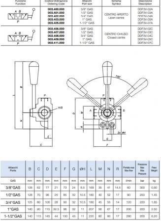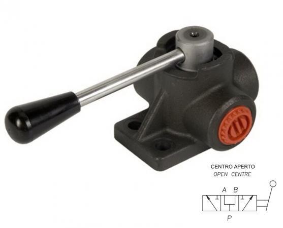 Трёхходовой кран с открытым центром. У крана три позиции рукояти: когда поток из Р линии к потребителю А и В полностью открыт – Pos.0 (центральная), когда поток из Р линии к потребителю А движется свободно, а к потребителю В заперт – Pos.1, когда поток из Р линии к потребителю В движется свободно, а к потребителю А заперт – Pos.2.
