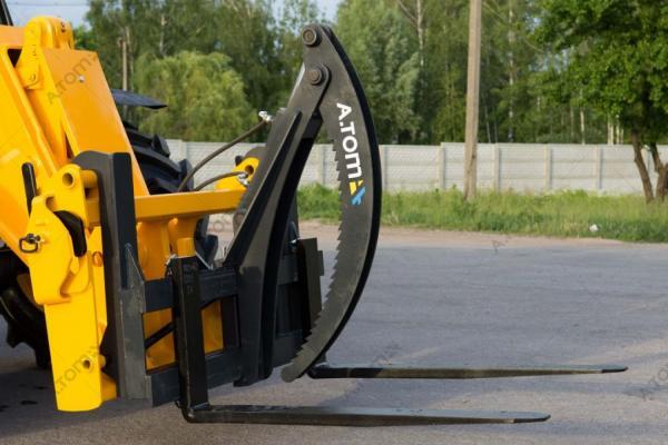 Захват для бревен, леса - AТOM ISO 2 — навесное оборудование, предназначенное для выполнения широкого спектра сельскохозяйственных, лесозаготовительных работ: погрузка, разгрузка и перемещение бревен, деревьев, веток, кустарников. Конструкция оснащена двумя гидроцилиндрами, регулирующими подъем/опускание специального прижима, предотвращающего выпадение бревен. Специальная форма вил нижней части захвата разработана таким образом, чтобы избежать повреждения груза цилиндрической формы, поэтому его можно применять для работы со столбами, рулонами, трубами.